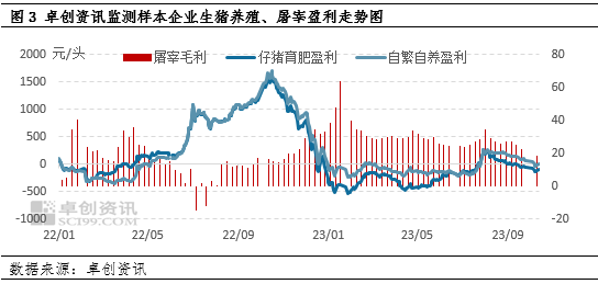 进入四季度,双节提振不及预期,猪价持续在成本线附近震荡,其主因是市场生猪供给能力较强,而需求虽较往年提升,但难以持续性消化市场供应。随着养殖端持续处于亏损状态,以及二次育肥行为减少,腌腊旺季到来之前,养殖端压栏增重迹象减少,市场理性情绪回归,供应或阶段性紧俏助推四季度猪价逐步复苏,有望站在成本线之上,预计四季度生猪价格环比上涨,且高点出现在11月份。据新牧网猪价指数,2023年10月24日,全国生猪均价为15.28元/公斤。环比下滑4.49%,同比下滑43.78%;据卓创资讯数据,标肥价差为0.48元/公斤,与去年同期相比收窄0.42元/公斤。目前养殖端多数处于亏损状态,需求虽较同期好转但难以持续性消化市场充沛的猪源,由于供应持续未见减少,生猪价格持续低迷,养殖亏损时间较长,部分市场的二次育肥行为逐步趋于理性,养殖端当下压栏情绪亦有降温,交易均重较同期水平下滑。2023年以来,除8月份养殖利润短暂回到了盈亏平衡线附近外,其他时间养殖利润基本处于亏损状态。最新数据显示,目前自繁自养养殖利润为-147元/头,外购仔猪育肥利润为-163元/头。从全年的平均利润看,2022年全年平均利润为162元/头,而2023年截至目前的平均利润为-231元/头,可见今年的养殖行业比2022年更加艰难。不过尽管养殖利润持续亏损,但是产能去化仍然不足。截至9月份,国家统计局数据显示,能繁母猪存栏4240万头,较2022年12月产能高峰下降3.4%。产能去化缓慢,原因是市场对四季度生猪行情有一定期待,不过笔者认为最主要的原因是因为今年以来在生猪养殖持续亏损的情况下,仔猪销售利润维持较好水平。随着猪价持续低迷,仔猪价格不断走低,目前7公斤仔猪价格为141元/头,较去年同期下降76%,仔猪销售利润由盈转亏,为-77元/头,意味着当前养殖端各环节均无利润,后期被动去产能速度或加快。据卓创资讯数据监测,截至2023年9月底,全国166家存栏样本显示能繁母猪存栏环比下滑1.14%,同比增加5.45%。生猪出栏环比增加3.03%,根据生产周期前置10月,生猪理论出栏增加3.00%左右。而据卓创资讯调研监测短期数据指标9月实际计划完成率101.37%,全国10月计划出栏增加2.95%。由于企业具备较强供给能力,虽局部地区疫情复发,但对实际生猪供应影响有限,这是导致猪价上涨动力不足,行业盈利仍处于低位水平及业者心态趋于理性的主要因素。生猪盈利驱动业者行为。据卓创资讯数据监测,截至2023年10月16日,养殖端仔猪育肥盈利为-101.61元/头,自繁自养盈利为1.58元/头,截至10月第二周,屠宰端毛利为18.24元/头。由于行业盈利持续低迷,行业内情绪性指标逐步回落。回归理性表现:二次育肥热度低于去年生猪交易均重上涨不及往年